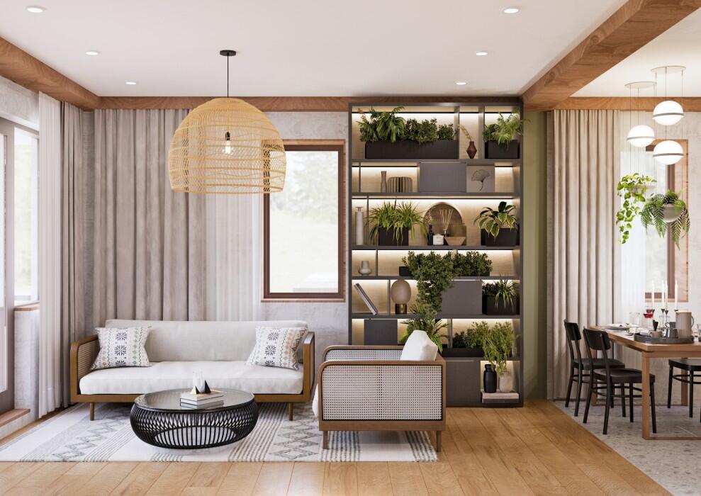 Гараж примыкает к дому, по соседству расположена мини котельная. Все жизнеобеспечивающие системы находятся вне жилой зоны. На первом этаже гостевая комната всегда доступна для компании друзей. Большая кухня и гостиная разместит всех желающих совместить приготовление пищи с общением. Просторный коридор после тамбура примыкает к широкой лестнице, ступени которой ведут на мансардный этаж.