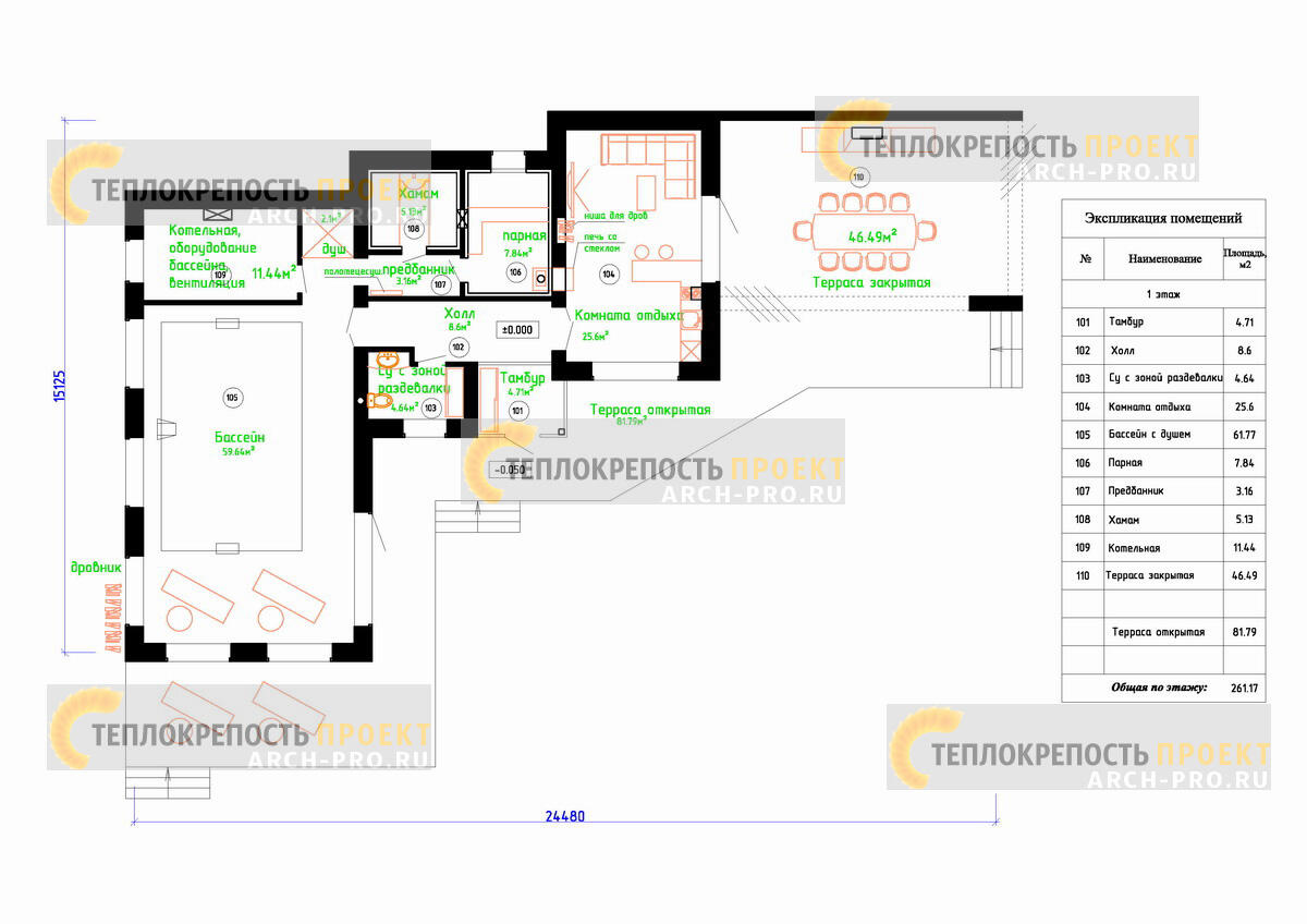 чаша бассейна, комната отдыха, русская парная, помещение для хамам, сан-узел.: