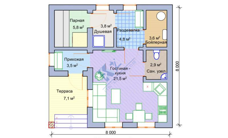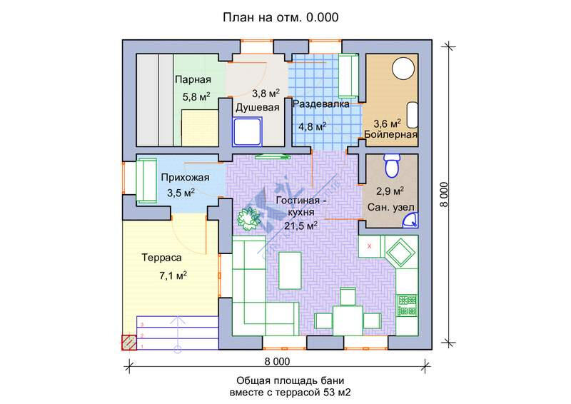 русская парная, кухня-гостиная , 1 сан-узел, терраса.: