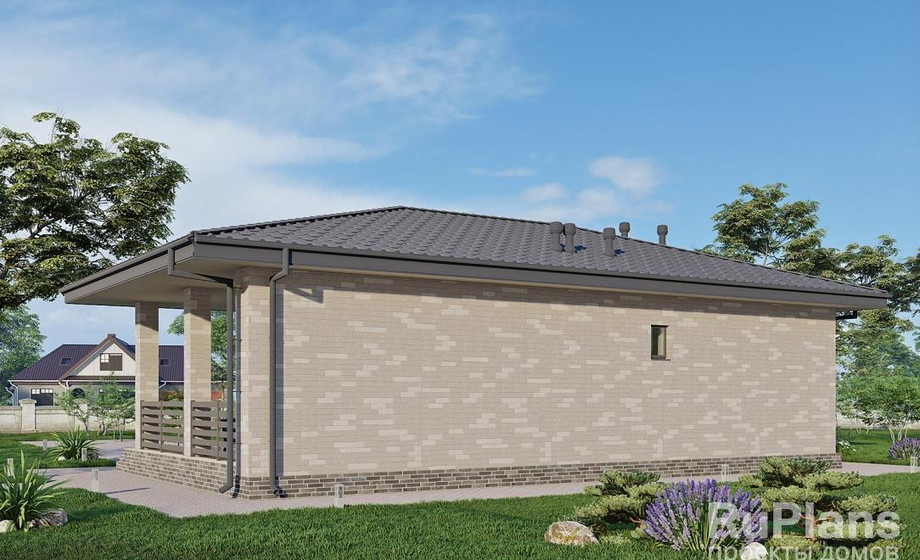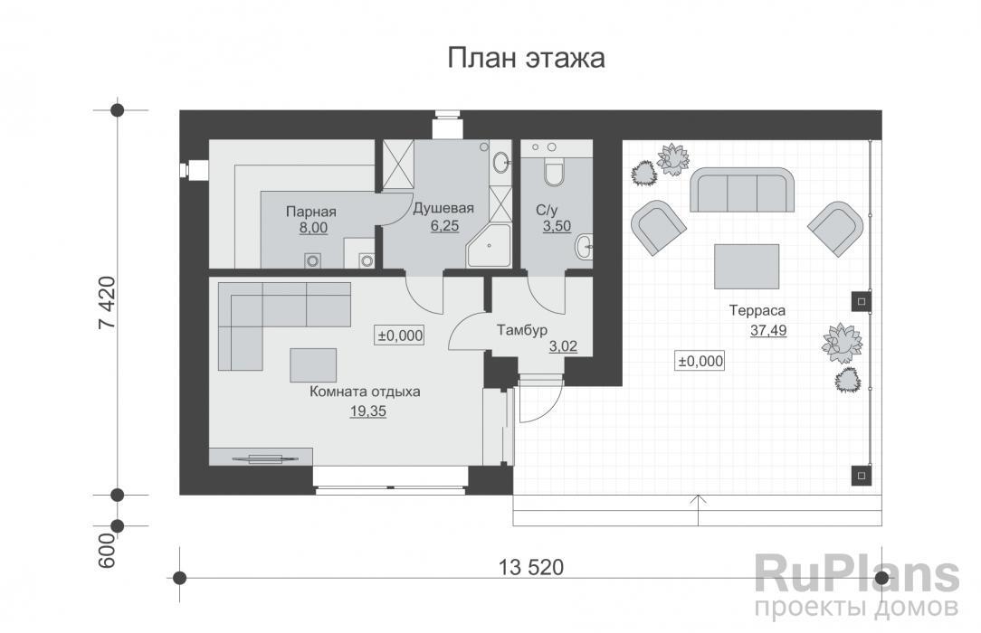 - Д-74. Баня с террасой 7,4 x 13,5 метров.