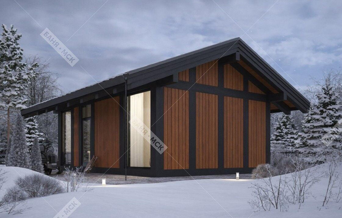 Предлагаем к строительству современный проект банного комплекса , разработанный в 2024 году для загородных участков. Размерами здания 6*8 метров.