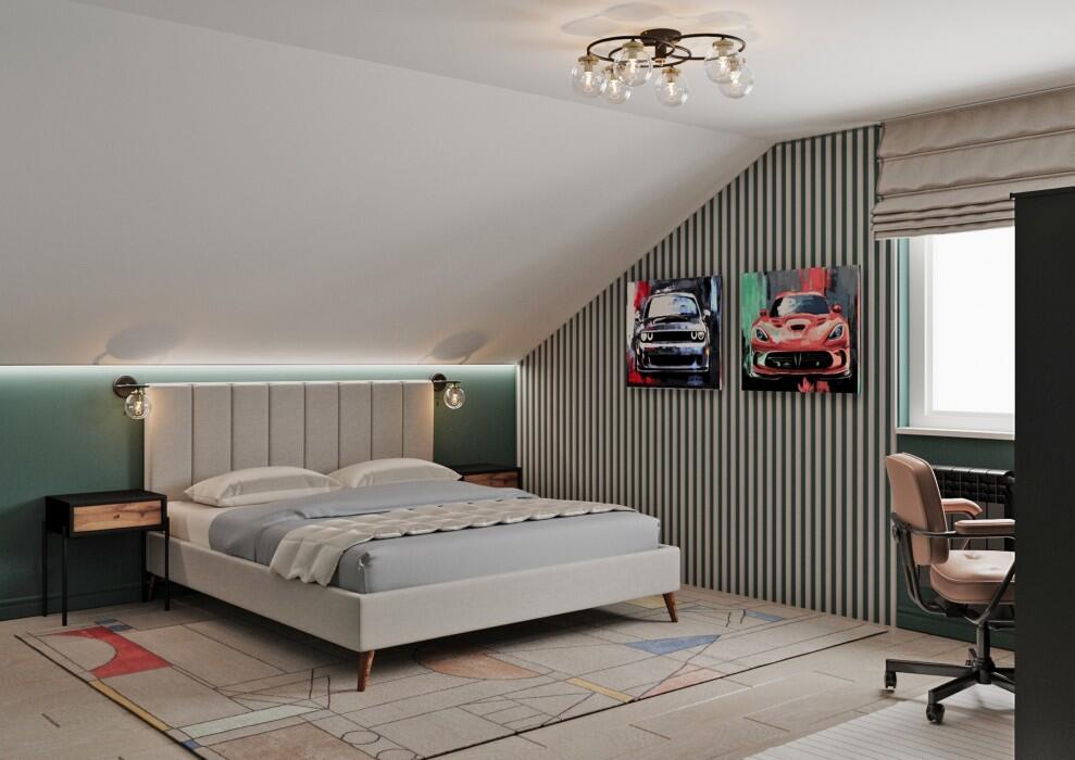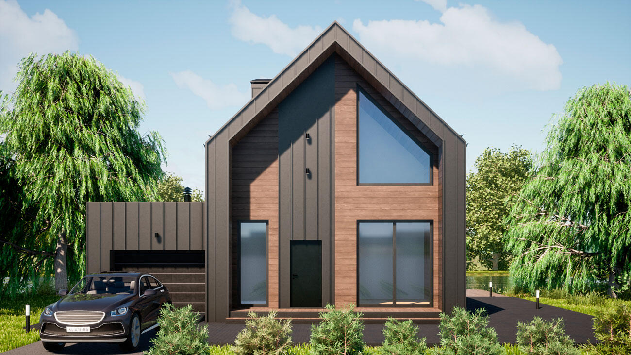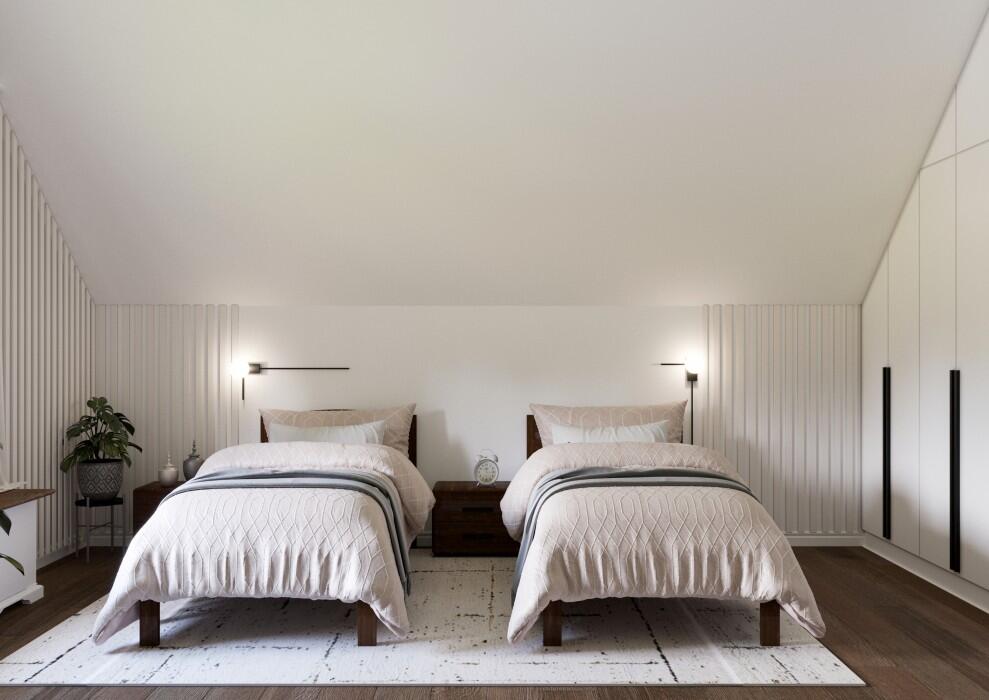 На втором этаже с мансардной крышей уютно расположены три изолированных жилых комнаты. Особенностью представленного проекта является строгий стиль с выдержанными прямыми линиями. Большие окна дают много света. Общая площадь составляет 161 кв. метр, что позволяет изолировать дополнительные помещения для хозяйственных нужд: кладовку, постирочную, техническую комнату.