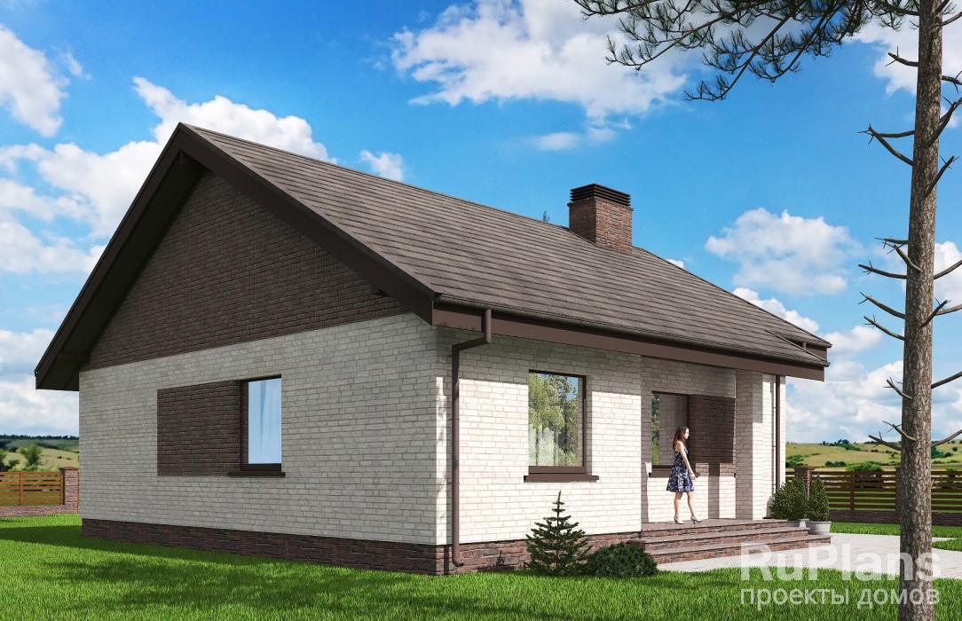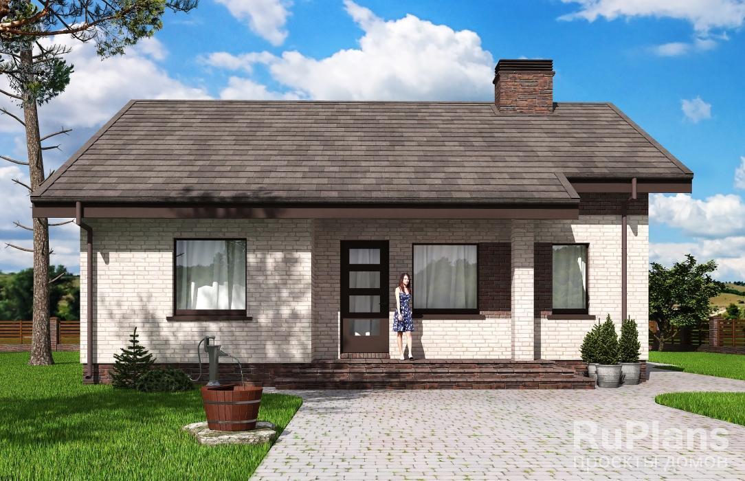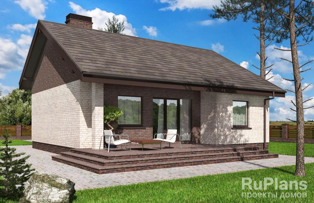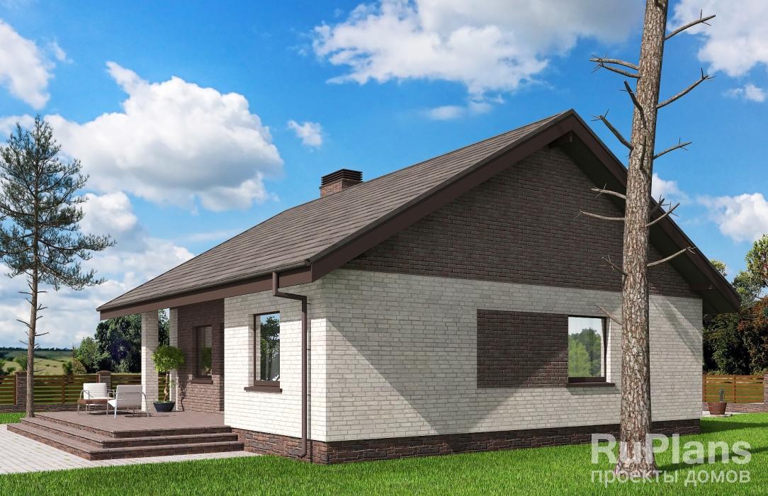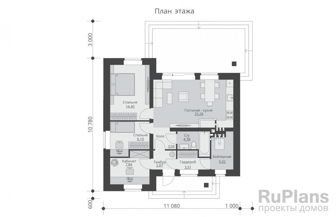 Строительство одноэтажного 2 спальни гостиная кабинет. с террасой и тремя спальнями. Размер дома 10,8 x 11,1 м метров. Высота здания 6.7 метров.