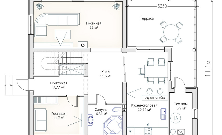 - С ОТДЕЛКОЙ .Т-65 Жилой коттедж 13.1 * 11.1 метров