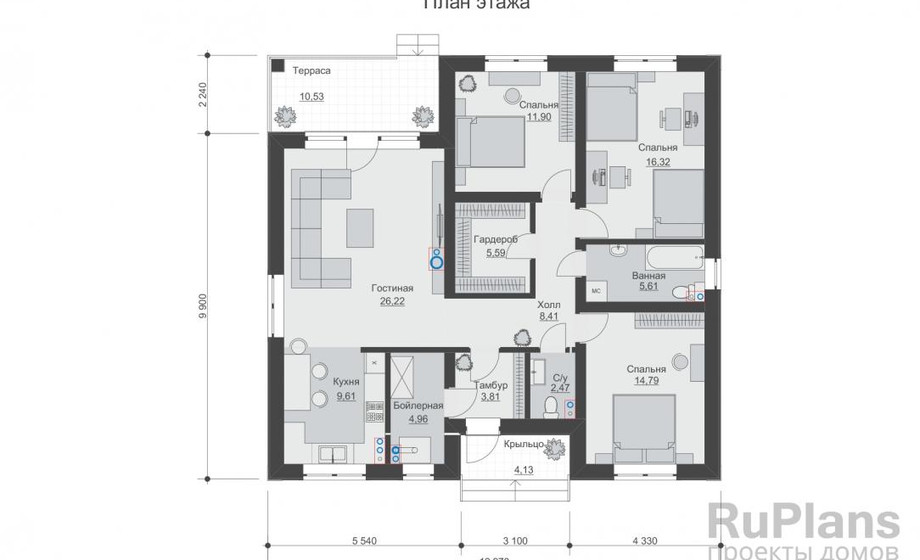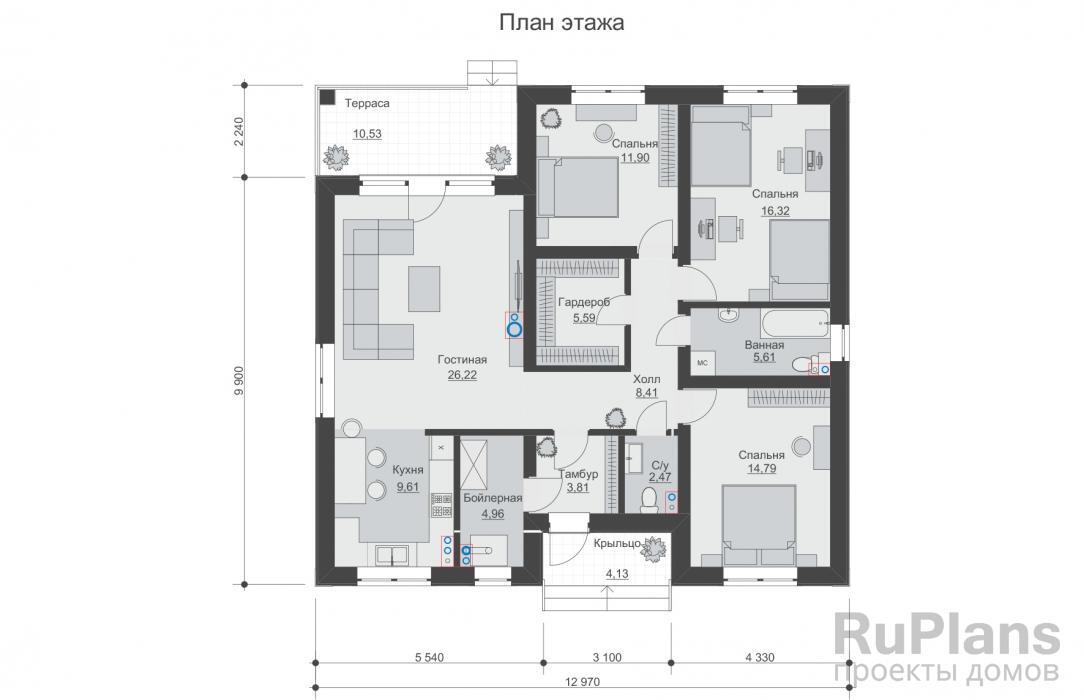 БД-08 Коттедж с тремя спальнями 11,3 x 12,1 м.