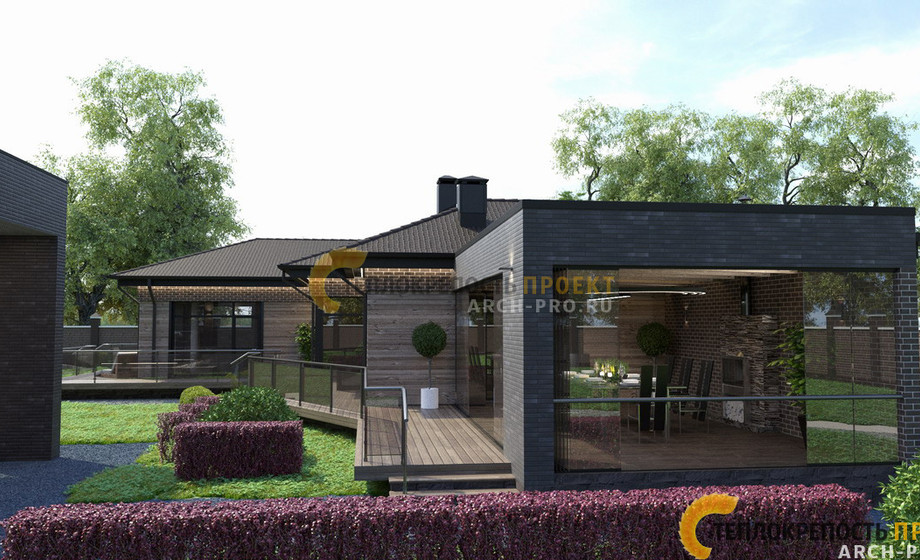Обилие окон в банном комплексе наполняет естественным светом даже самые дальние уголки и закутки помещений, умеренная приземистость и горизонтальная вытянутость придает строениям надежную основательность, а широкие свесы крыши защищают стены строений от осадков, а внутренне пространство – от жарких солнечных лучей.