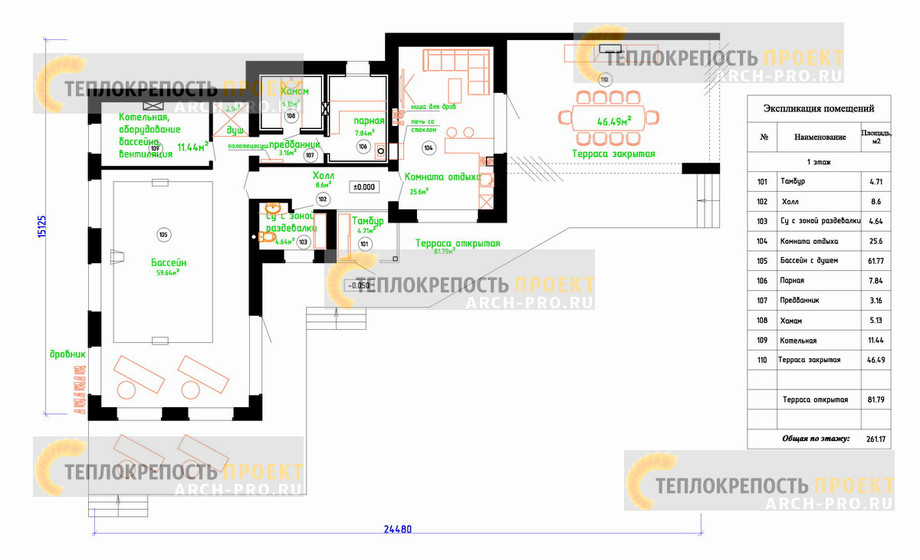 чаша бассейна, комната отдыха, русская парная, помещение для хамам, сан-узел.:
